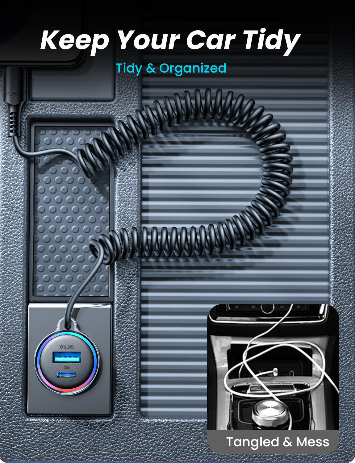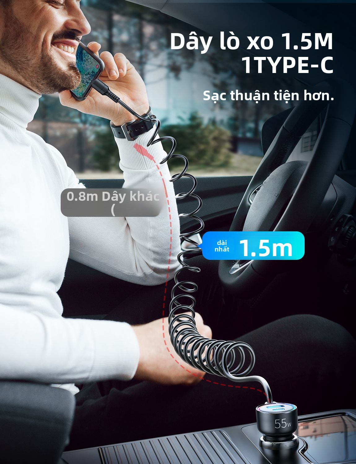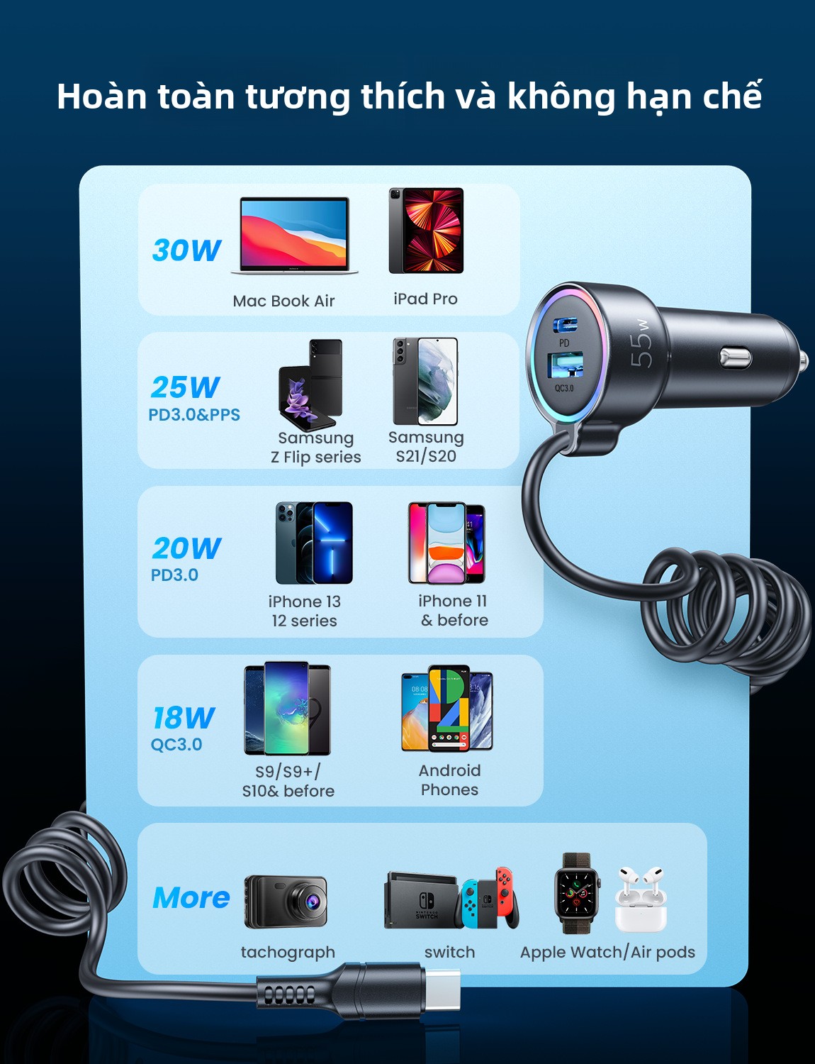 Sạc tẩu xe 90W sạc nhanh 3 trong 1 với dây sạc xe ô tô chung đèn khí quyển điện thoại di động sạ